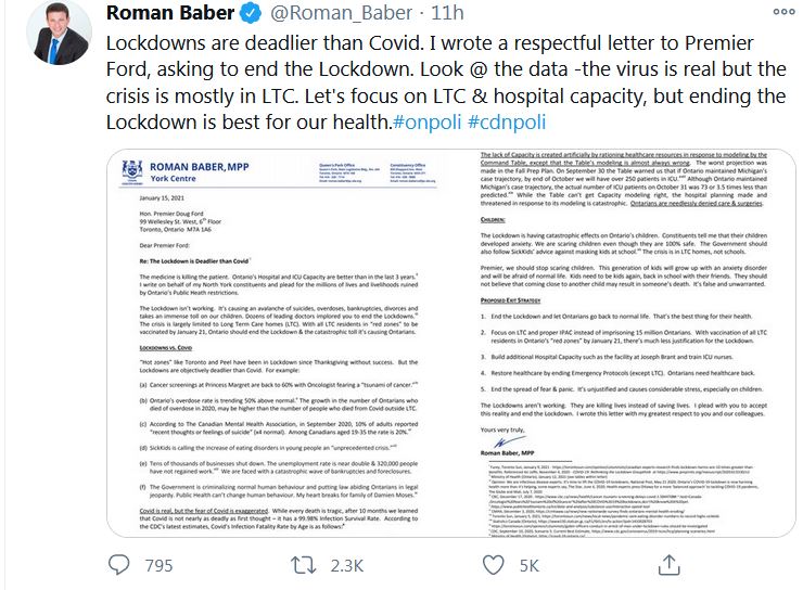 Но, не удержался на своем стуле. Угораздило его выразить свою позицию насчет коронавирусных ограничений в Твиттере. Да еще и не просто так, а в формате двухстраничного открытого письма своему патрону Дагу Форду. Как по щекам привселюдно отхлестал.